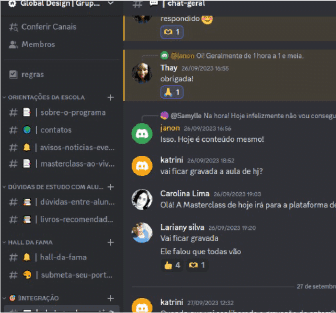 Participe desde o início semanalmente, nas aulas e mentorias ao vivo para dúvidas das aulas, orientação de projetos, aulas sobre temas específicos, desenvolvimento profissional e mentoria sobre os portfólios. *(verifique o plano)