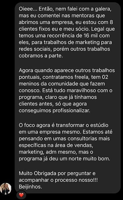 Você aprenderá habilidades essenciais como gestão de projetos, posicionamento digital, habilidades de negociação, entrega de valor para seus clientes, precificação estratégica e planejamento estratégico, que capacitam você a transformar sua atividade profissional em uma empresa individual ou coletiva!